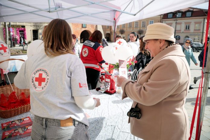 Kwiaty, czerwone pomadki, przypinki i praktyczna wiedza o bezpieczeństwie – tak wyglądało tegoroczne świętowanie Dnia Kobiet zorganizowane przez Lubelski Oddział Okręgowy Polskiego Czerwonego Krzyża. W niedzielę (8 marca) na Placu Łokietka w Lublinie panie mogły nie tylko otrzymać symbolicznego tulipana, ale także dowiedzieć się, jak zadbać o własne zdrowie i bezpieczeństwo w sytuacjach kryzysowych.