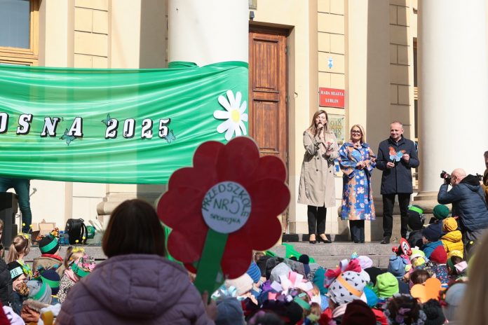 Lubelskie przedszkolaki już po raz ósmy przywitały wiosnę w naszym mieście. W piątek (21 marca) plac przed Ratuszem zmienił się w wiosenną krainę pełną radości, muzyki i kolorów. Było m.in. wspólne tworzenie kwiatowego baneru, pszczeli taniec oraz wiosenny quiz.