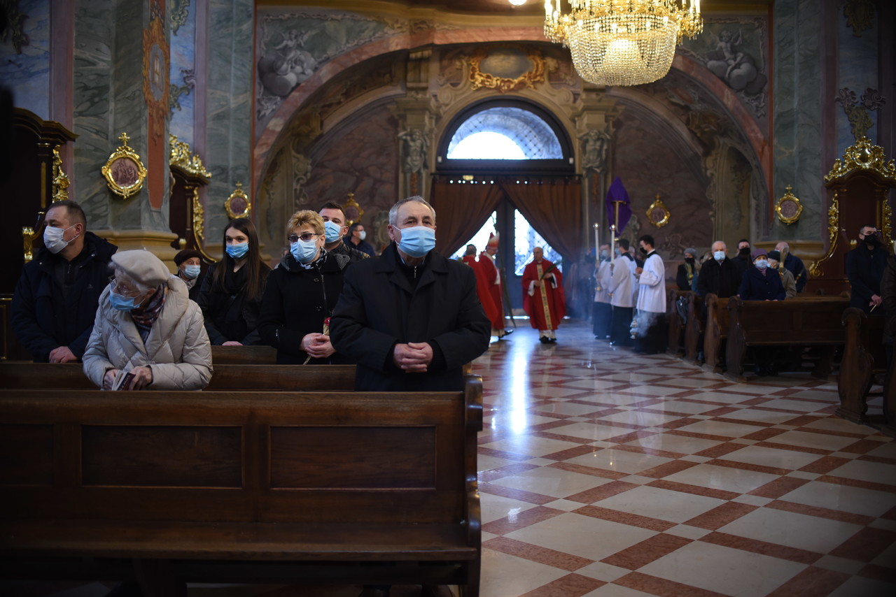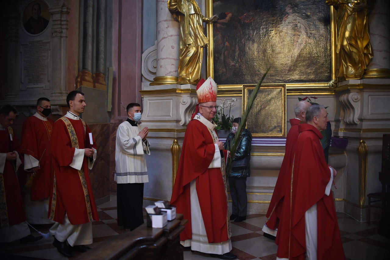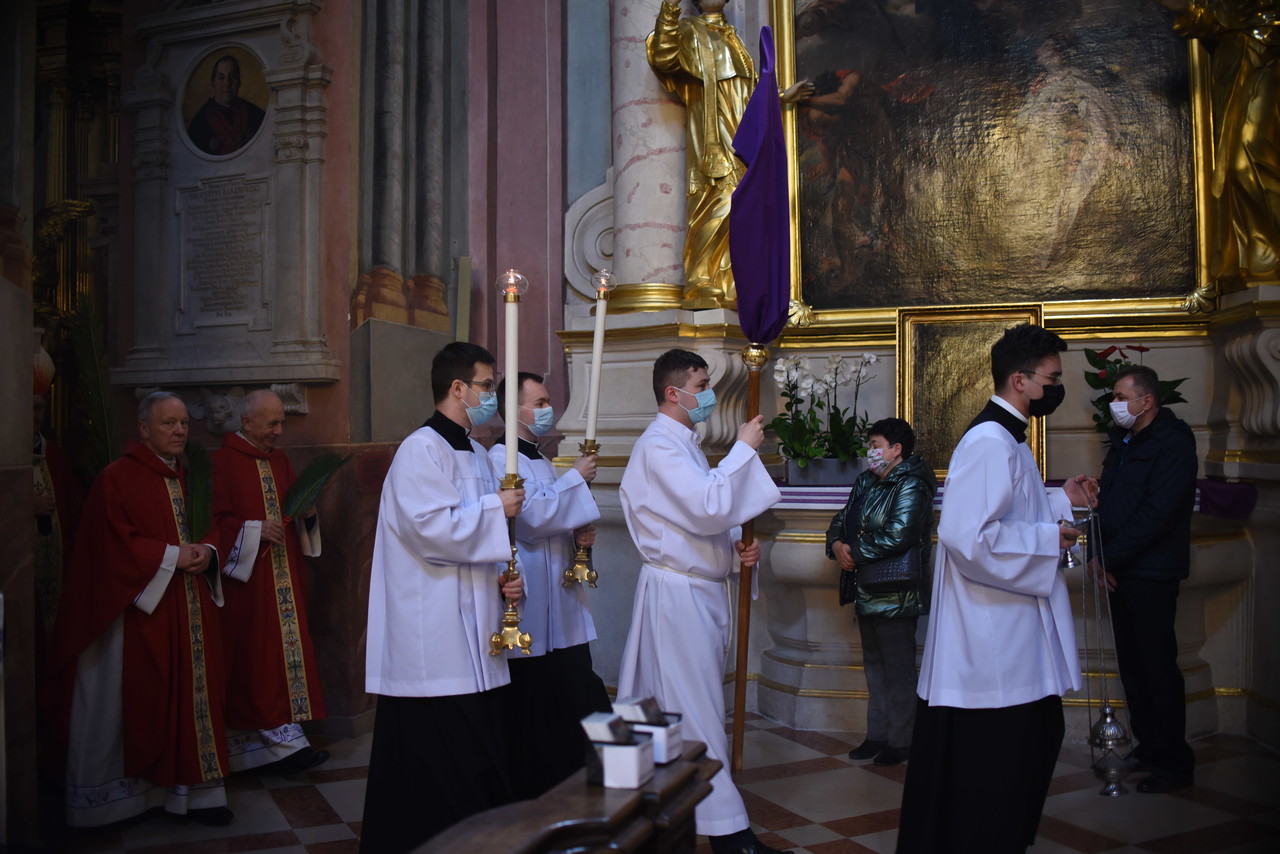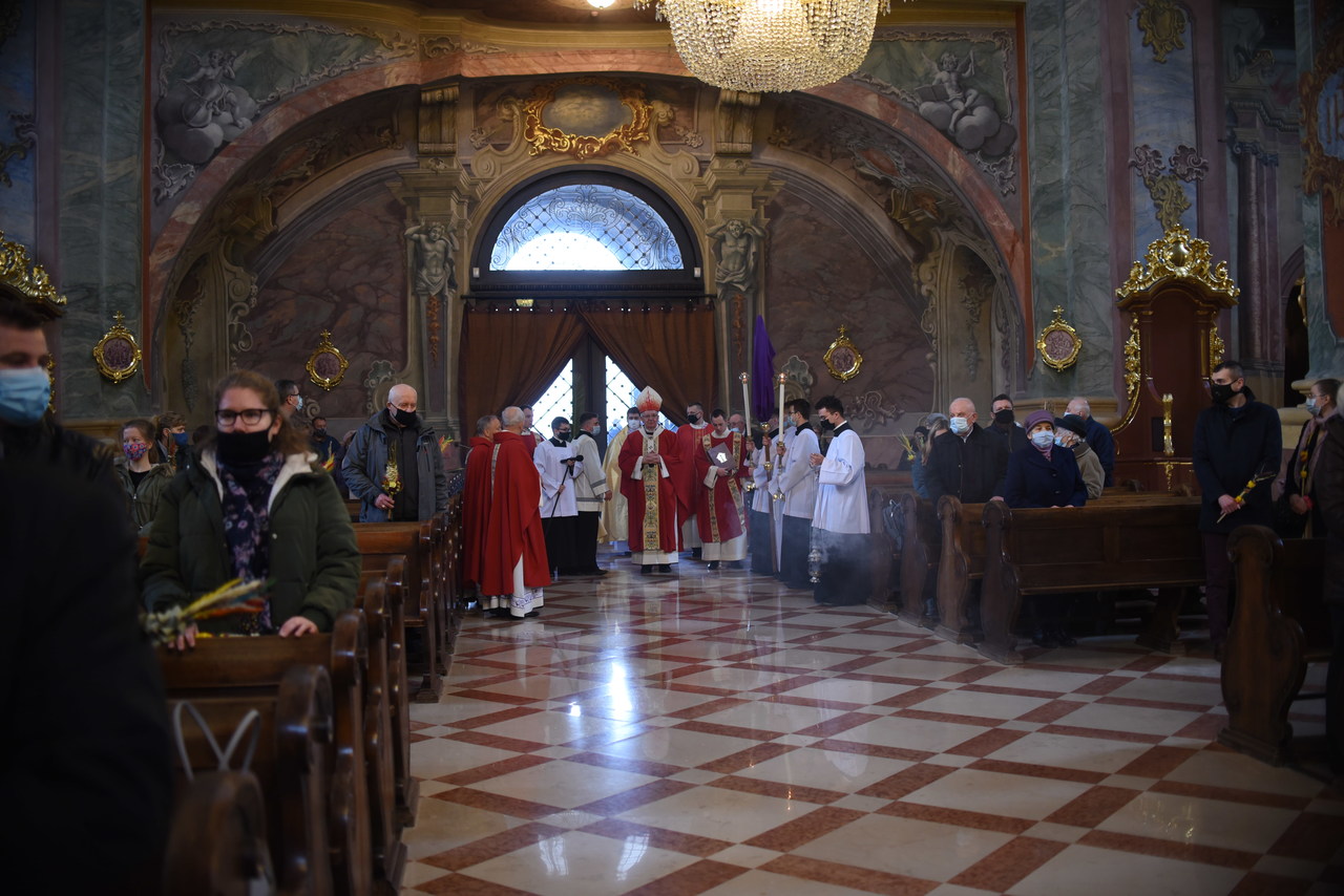 Najpierw liczenie wiernych, potem msza święta przy limicie wiernych – tak wyglądała Niedziela Palmowa w archikatedrze lubelskiej. We mszy świętej o godzinie 11.30 wzięło udział 60 osób wewnątrz kościoła i kilkadziesiąt przed świątynią. Mszę z uroczystą procesją odprawił ksiądz arcybiskup Stanisław Budzik, metropolita lubelski.