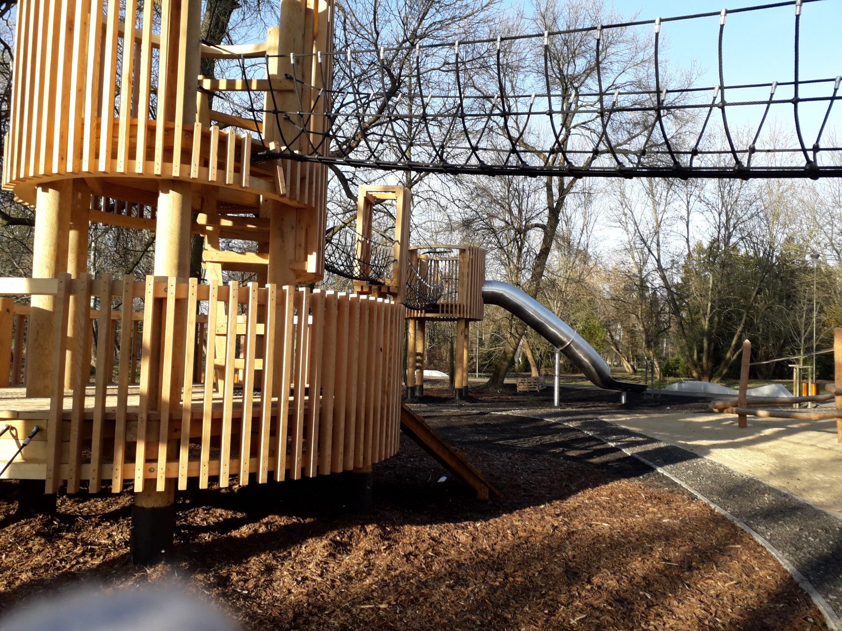 W części wschodniej parku na nawierzchni piaskowej otoczonej palisadą zaprojektowano przestrzeń dla najmłodszych w wieku 1 do 4 lat, obok część dla dzieci starszych w wieku 3-7 lat. Wśród wielu urządzeń tego placu znalazły się domek zabawowy, mini tor przeszkód, bujaki: kozioł, ślimak, żuczek, a także huśtawka, karuzela, kolejka, pociąg drewniany, liczydła i duża wieża z wyciągarką piasku. Drugi plac zabaw przeznaczony dla dzieci starszych od 7 roku życia wyznaczono w północno-wschodniej części parku pomiędzy aleją Piłsudskiego a główną aleją parkową.