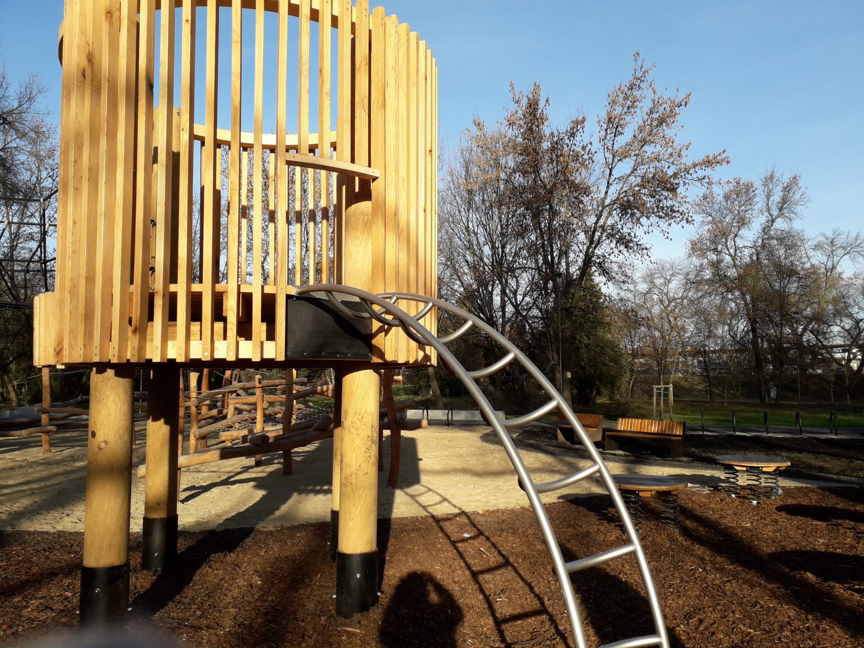 W części wschodniej parku na nawierzchni piaskowej otoczonej palisadą zaprojektowano przestrzeń dla najmłodszych w wieku 1 do 4 lat, obok część dla dzieci starszych w wieku 3-7 lat. Wśród wielu urządzeń tego placu znalazły się domek zabawowy, mini tor przeszkód, bujaki: kozioł, ślimak, żuczek, a także huśtawka, karuzela, kolejka, pociąg drewniany, liczydła i duża wieża z wyciągarką piasku. Drugi plac zabaw przeznaczony dla dzieci starszych od 7 roku życia wyznaczono w północno-wschodniej części parku pomiędzy aleją Piłsudskiego a główną aleją parkową.