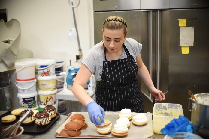 Tutaj kupimy pączki z truskawką i posypką pistacjową, wiśniowe, malinowe oraz ze słonym karmelem i popcornem. Czas zrobienia jednego pączka to około 20 minut. – Pączek musi wystygnąć, żebyśmy mogli go lukrować i używać posypek. Będziemy pracować nad nimi już w nocy, żeby te pączusie były rano świeże dla naszych gości – zaznacza pani Barbara.