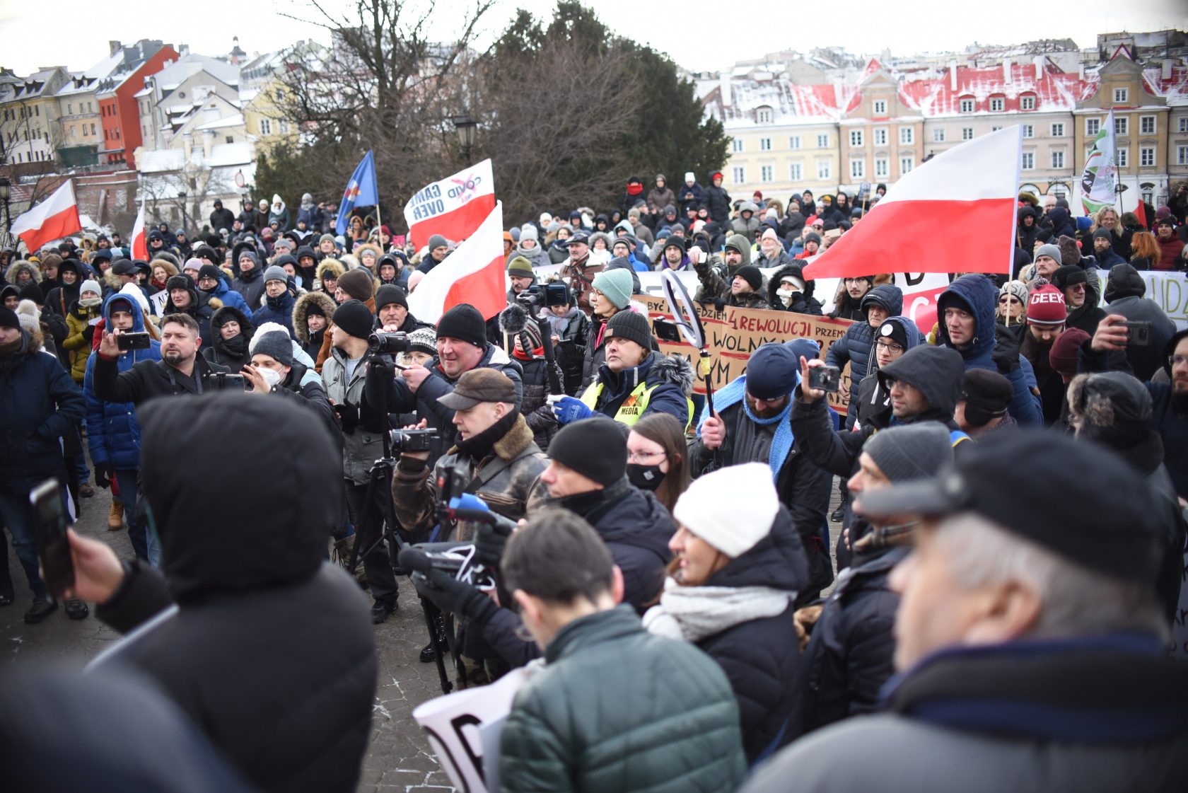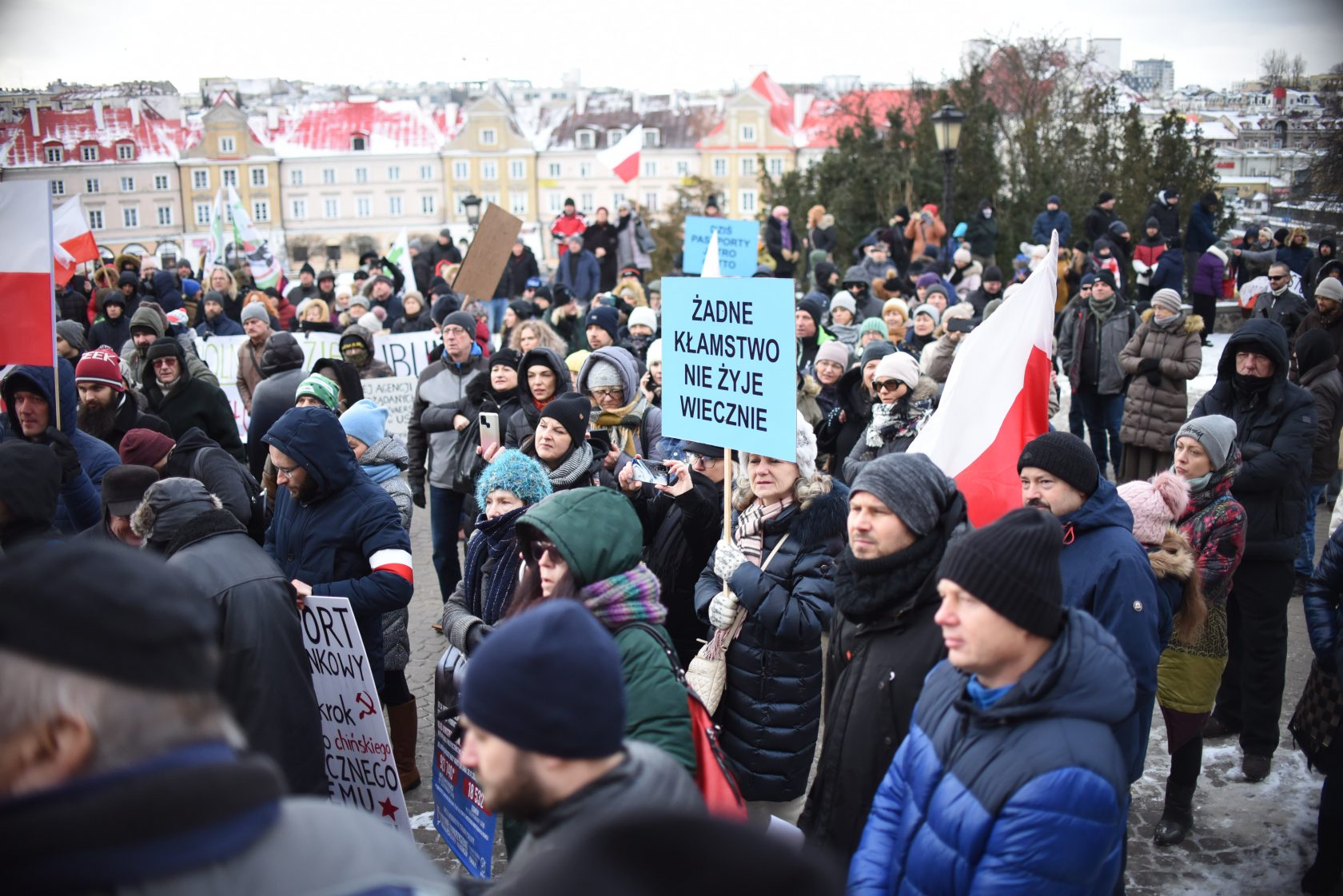 W sobotę (22 stycznia) przed Zamkiem Lubelskim zgromadzili się m.in. przeciwnicy segregacji sanitarnej oraz przymusu szczepień na COVID-19. Uczestnicy protestowali również przeciwko podwyżkom cen. Następnie przeszli Starym Miastem na plac Litewski.
